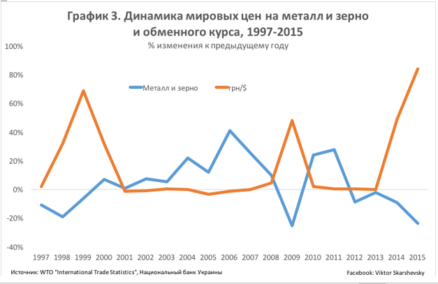 Обменный курс в маленькой бедной открытой сырьевой экономике, каковой является Украина, в среднесрочном плане зависит не от кредитов международных финансовых организаций, а как показывает статистика последних 20 лет, прежде всего, от динамики мировых цен на металл и зерно (см. График).