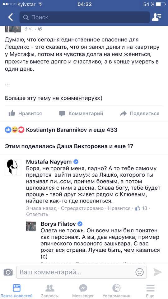 Есть версия, что это была революция. Но, ведь, революция это прежде всего смена элит. А я вот чем больше общаюсь с нынешней элитой, тем чаще ловлю себя на мысли, что никакой смены НЕ БЫЛО. Вот новый перл из переписки "лучших из лучших среди украинцев". Кто не в курсе - это по поводу разгорающегося скандала с покупкой квартиры С. Лещенко, денег на которую у борца с коррупцией, судя по декларации, совершенно не могло быть.