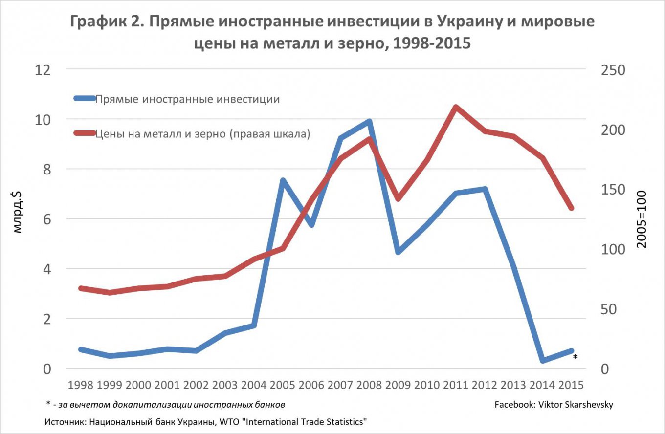 По факту, приток прямых иностранных инвестиций в Украину увеличивается в период высоких цен на основные экспортные украинские товары и стабильного валютного курса (см. График 2), а не во время и не из-за предоставления кредитов МВФ.