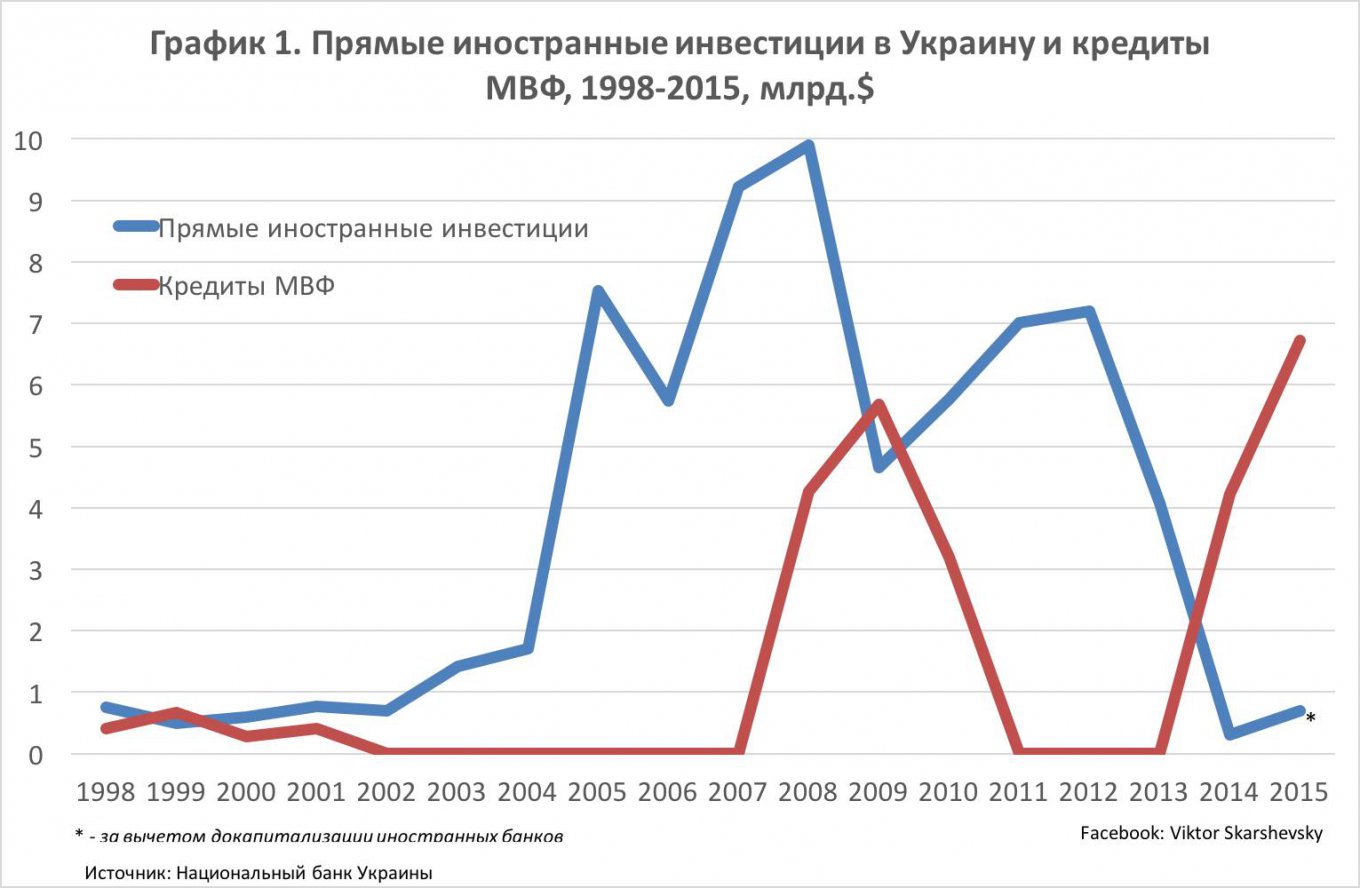 Да и статистика за последние 20 лет показывает, что нет никакой зависимости от предоставления кредитов МВФ и увеличения притока прямых иностранных инвестиций (см. График 1). Наибольший объем инвестиций поступил в Украину в период отсутствия кредитов от МВФ (в 2002-2007 и 2011-2013).