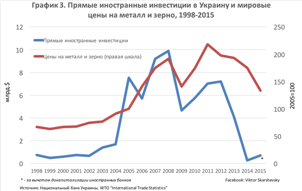 По факту, приток прямых иностранных инвестиций в Украину увеличивается в период высоких цен на основные экспортные украинские товары и стабильного валютного курса (см. График 3), а не во время и не из-за предоставления кредитов МВФ.