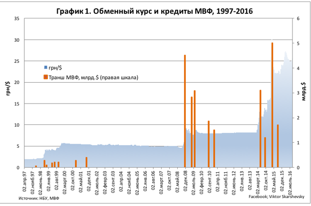 С 5 мая 2014 по 4 августа 2015 года МВФ предоставил Украине кредитов на рекордную сумму $11 млрд, а гривна за это время девальвировала в 1,9 раза и продолжила дальше обесцениваться.