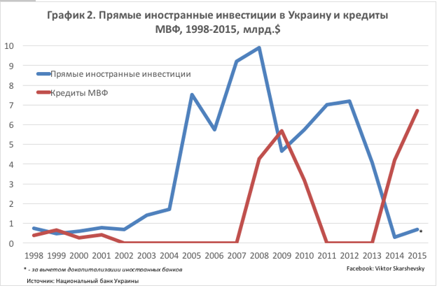 Да и статистика за последние 20 лет показывает, что нет никакой зависимости от предоставления кредитов МВФ и увеличения притока прямых иностранных инвестиций (см. График 2). Наибольший объем инвестиций поступил в Украину в период отсутствия кредитов от МВФ (в 2002-2007 и 2011-2013).