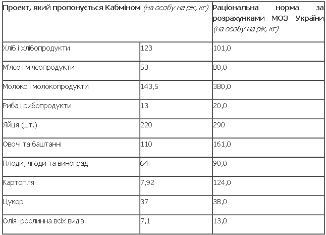 Якщо порахувати необхідну щомісячну вартість продуктів харчування для середньостатистичного українця за ринковими цінами, то за нормами Кабміну вона співмірна з мінімальною заробітною платою, яка з 1 травня 2016 року становить – 1450 гривень. Фактична вартість необхідної раціональної норми продуктів харчування вдвічі вища і становить не менше 2800 гривень.