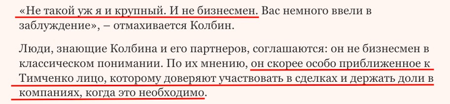 В общем никакой Колбин не инвестор и не бизнесмен, а преобычный кошелек. Думали сначала, что он кошелек Тимченко, но выяснилось, что к Путину он в сто раз ближе.