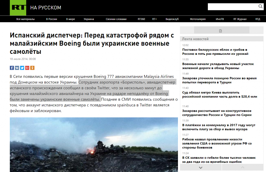«Сотрудник аэропорта «Борисполь», авиадиспетчер испанского происхождения сообщил в своём Twitter, что за несколько минут до крушения малайзийского авиалайнера на Украине на радаре неподалёку от Boeing были замечены украинские военные самолёты», — не моргнув глазом сообщает российский телеканал уже в полночь.