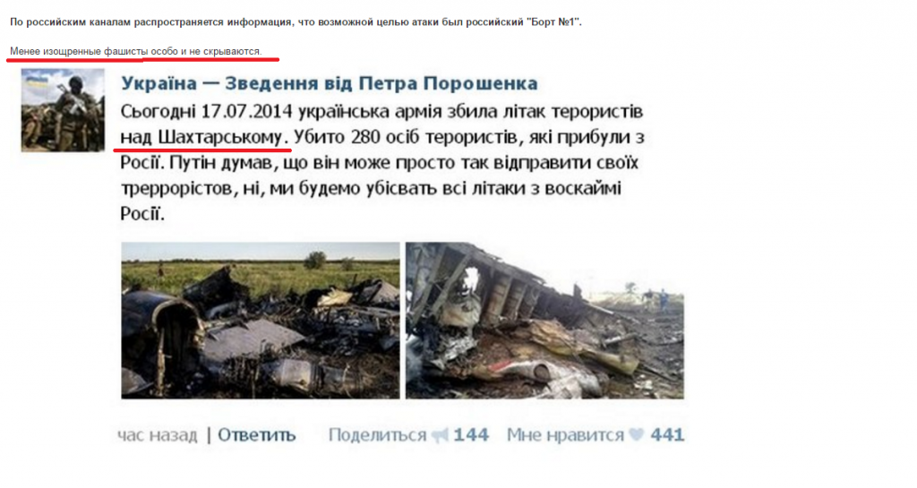 А там не только про «диспетчера Карлоса», но и адский трэш из каких-то левых аккаунтов в Твиттере и Вконтакте, где якобы украинские фашисты на ломаном украинском языке сами признаются, что сбили «Боинг». Тупость поста зашкаливает. Поскольку все это фабриковалось вечером 17 июля, в день катастрофы — сделано все очень криво. Никто даже не смог грамотно перевести русский текст через гугл транслейт.