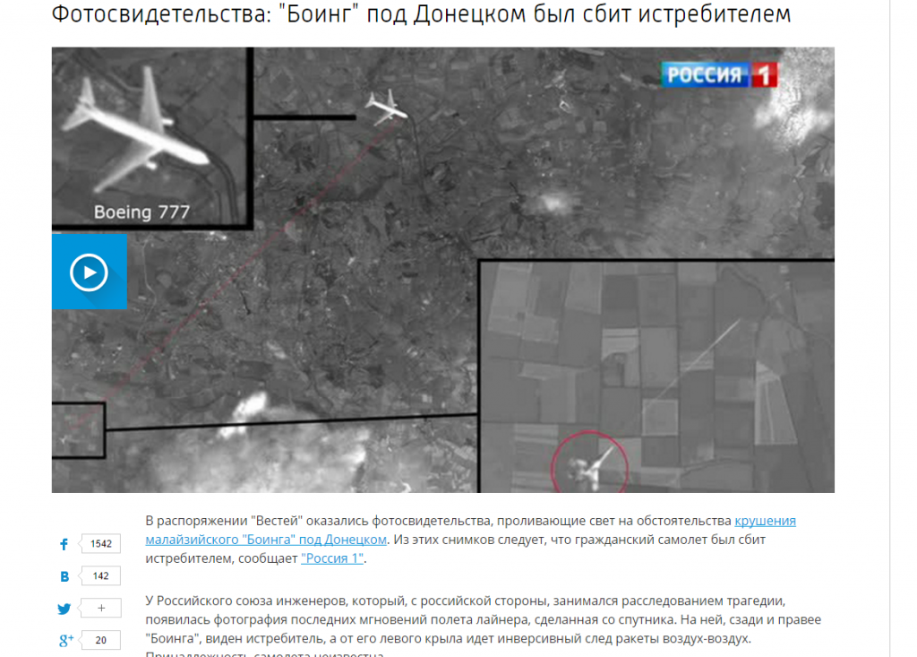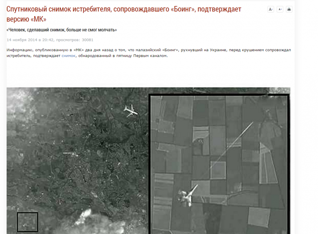 «Спутниковый снимок истребителя, сопровождавшего «Боинг», подтверждает версию «МК» — пишет «Московский комсомолец». И размещает в статье ссылку на свою предыдущую лживую публикацию.