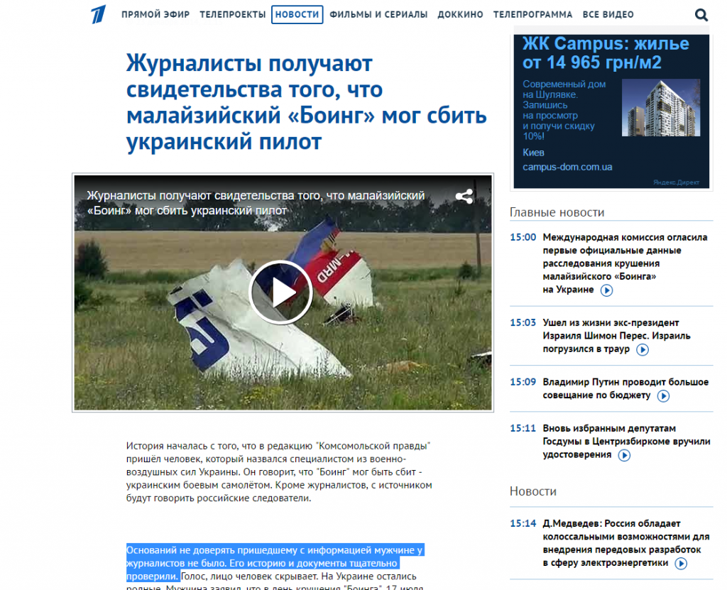 6. Ну и конечно же никак нельзя не включить в хит-парад псевдообъективную и псевдонезависимую российскую «Медузу», которая в своем репортаже с места крушения «Боинга» этим летом также напечатала лживые показания псевдосвидетелей. Манипуляция тут более тонкая, чем в государственных СМИ России, но посыл также вполне понятен — «люди все видели своими глазами». Формально журналисты остаются чистыми, поскольку всего лишь цитируют слова местных жителей. Но наметанный глаз легко распознает манипуляцию и лживый вброс.