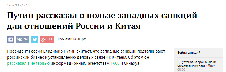 «Не соглашусь с тем, что введенные отдельными западными странами нелегитимные ограничения в отношении России оказывают негативное влияние на российско-китайское экономическое взаимодействие. Как раз наоборот, это стимулирует наш отечественный бизнес к развитию устойчивых деловых связей с Китаем», — Владимир Путин.