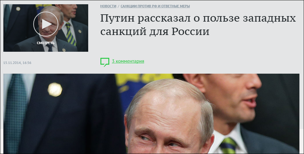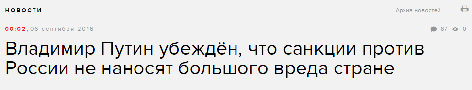 «Владимир Путин убеждён, что санкции против России не наносят большого вреда стране. Об этом он заявил по итогам встречи с американским президентом Бараком Обамой», — «Эхо Москвы».