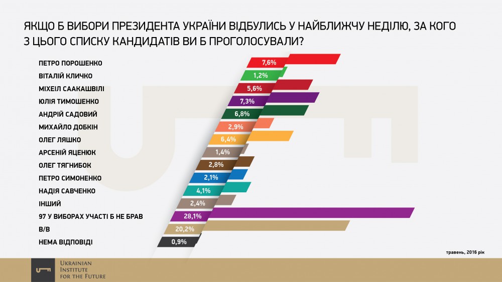 В мае 2016 года Украинский Институт Будущего проводил социологию, которая показала, что президентский рейтинг Саакашвили составлял около 6%. (при этом, конечно Саакашвили не имеет права участвовать в президентской гонке)
