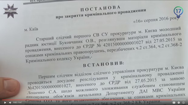 Журналісти 17 канала, які не так давно змогли потрапити до саду цього елітного будинку отримали від самого Єршова копію постанови про закриття зазначеного кримінального провадження, яка 16.08.2016 була прийнята старшим слідчим чомусь прокуратури м. Києва Буковчаником О.В.