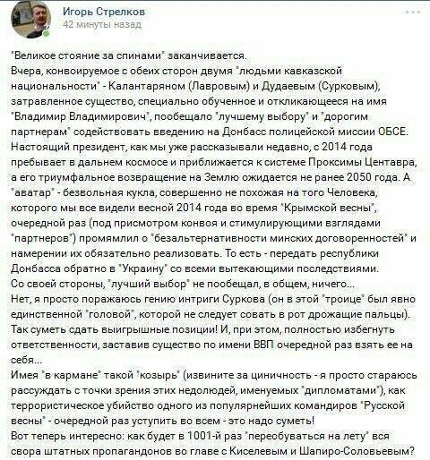 А Гиркин пусть комментирует, с такими текстами он скоро пойдет по стопам "Моторолы". Но не из-за критики Путина ликвидируют Гиркина - Путину не нужны свидетели его позора и военных преступлений спецслужб и армии РФ на Донбассе. Список на зачистку длинный.