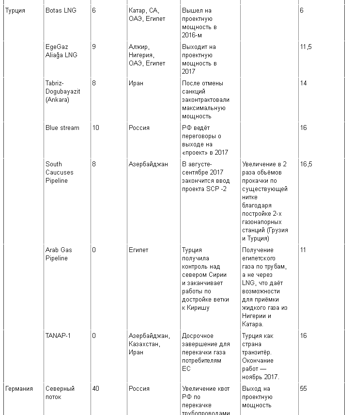 Ниже я привожу таблицу существующих (!!!) на сегодня объектов, позволяющих поставлять газ в Европу. Все они построены за последние 10-12 лет и в 2017 году значительная часть из них выходит на проектную мощность.