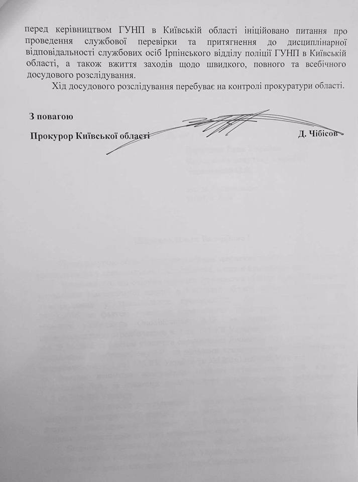 Прокуратура також вимагала вжити дисциплінарних заходів до тих слідчих Ірпінського відлілу Нацполіції, які гальмують розслідування. Але поліція не прореагувала і на це.