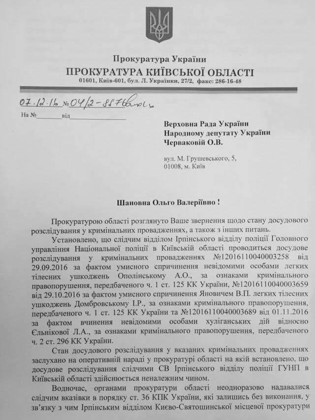 "Стан досудового розслідування по вказаних кримінальних провадженнях заслухано на оперативній нараді у прокуратурі області, на якій встановлено, що досудове розслідування слідчими СВ Ірпінського відділу поліції ГУНП в Київській області здійснюється неналежним чином, - йдеться у документі. - Водночас, органами прокуратури області неодноразово надавалися слідчим вказівки в порядку ст. 36 КПК України, які залишились без виконання".
