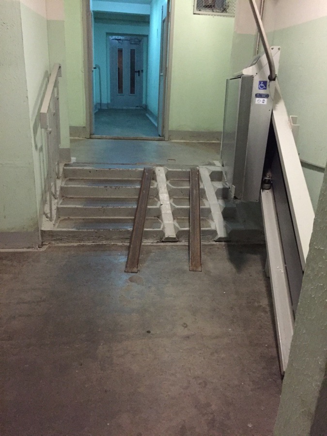 Москва. В одном из подъездов (дом 2008 года постройки) сразу 3 вида пандусов. Сдавали дом, видимо, только с первым, который является частью лестницы, второй (современный подъёмник) был установлен позже, а так как он, конечно же, не работает и мешает пользоваться первым, то поверх всего установили третий (металлический). Ждем четвёртый.