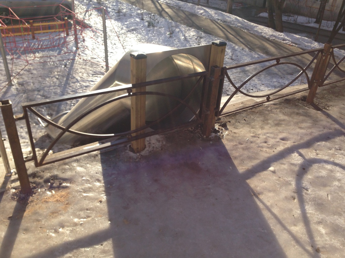 У нас тоже начали строить горки с использованием рельефа местности! Например, такую горку сделали в Москве, во дворах домов на Шелепихинском шоссе. Причём не просто так сделали, а закрыли кусок парковки и на его месте соорудили продолжение игровой площадки. Но потом что-то пошло не так...