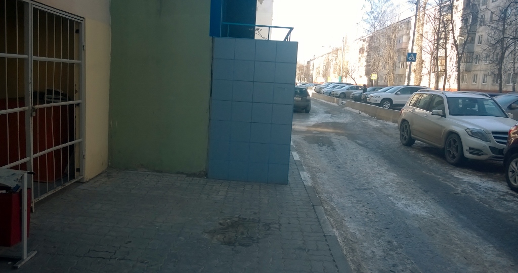 Но когда дом был уже сдан, кто-то решил нежилое помещение на 1-м этаже переделать под офис и, не особо думая о пешеходах, пристроил крыльцо прямо посреди тротуара. Теперь здесь не пройти и не проехать с коляской или на велосипеде. Нужно в любом случае спускаться с бордюра на проезжую часть/парковку. Такая вот безбарьерная среда.
