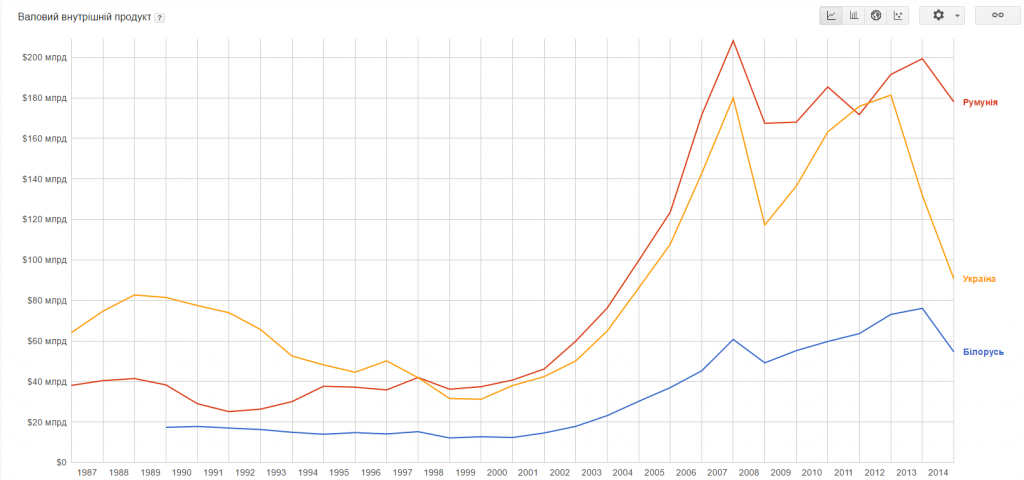 В 1991 году ВВП Румынии составлял 28,8 мрд долларов. В последующие годы он упал еще ниже. ВВП Украины в это же время составлял около 77 млрд. Сегодня же Румыния опережает нас с большим отрывом. Причем опережение это началось еще до войны.