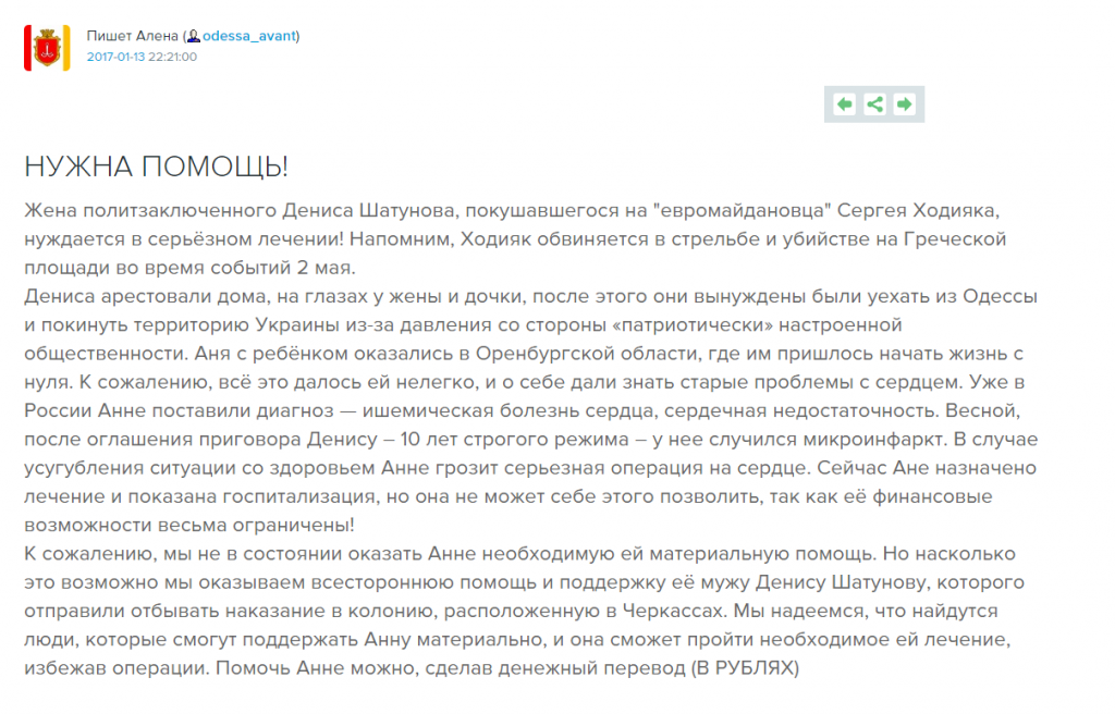 Теперь он отбывает срок в колонии, а жена и ребенок мыкаются в России, без денег и перспектив, в какой-то глуши. Жена Шатунова из-за всех событий заболела и собирает деньги на лечение. Путин и Стрелков не помогают. Виновата во всем, конечно же, хунта.