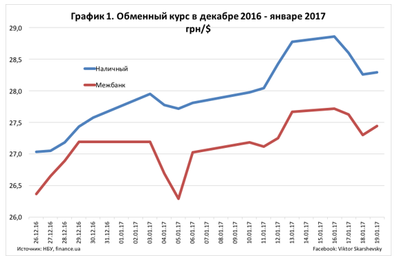 Стартовав 26-го декабря с 27 грн/$, достигнув максимума 16-го января 29 грн/$, наличный обменный курс откатился до 28,3 грн/$ 19-го января (см. График 1).