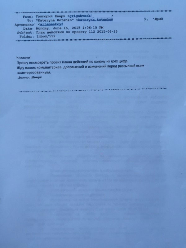 План було надіслано 2015 року тодішнім членом Нацради з питань телебачення та радіо, а нині депутатом від БПП Григорієм Шверком двом адресатам – Катерині Котенко та Юрію Артеменку, які обіймали посади відповідального секретаря та голови Нацради.