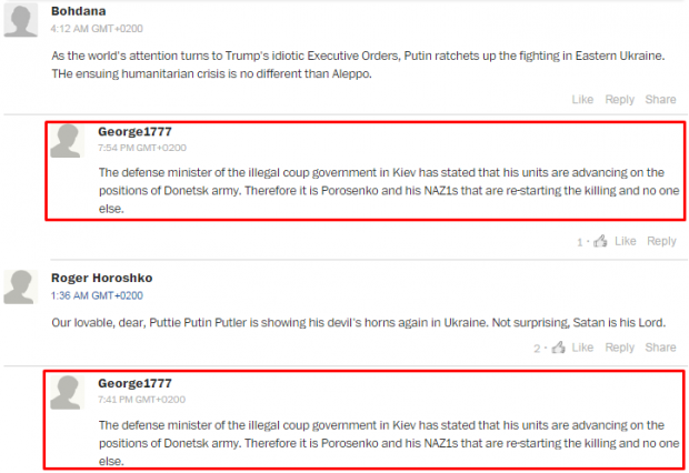 Порою тролли даже не утруждают себя и банально копируют один и тот же текст для ответов разным пользователям. Например, тролль под ником George1777 одинаково отвечает всем: "Министр обороны незаконного правительства, пришедшего к власти путем переворота в Киеве, заявил, что его войска выдвигаются на позиции Донецкой армии. Поэтому Порошенко и его нацисты вновь начинают убивать".