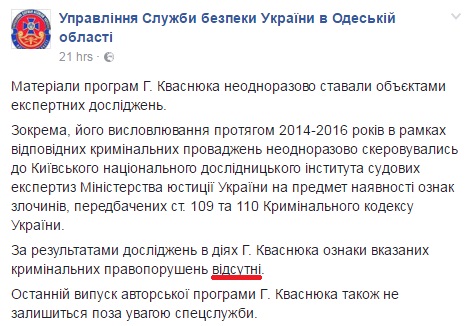 Так, намедни, управление службы безопасности Украины в Одесской области оправдало Гриху Кваснюка, который выливал декалитры российской пропаганды с экрана ТВ, сея вражду и ненависть, а после бегства из Одессы продолжал в том же духе, но уже в формате сепарского и российского ТВ. Оправдали, ссылаясь на исследования Киевского национального исследовательского института судебных экспертиз Минюста Украины… которые ничего антиукраинского в высказываниях Кваснюка за 2014-2016 гг не обнаружил.