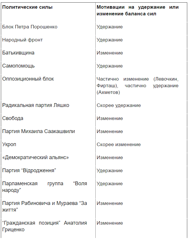 С другой стороны кризис заставил часть потенциальных противников заключить своеобразный «пакт о перемирии». Силы, понимающие, что следующий парламент в случае досрочных выборов будет намного хуже теперешнего, а сам политический кризис может повлечь дезинтеграцию страны, действуют на удержание ситуации. Костяком «играющих на удержание» являются БПП и НФ с «сателлитами» в виде различных депутатских групп, составленных из мажоритарщиков. По состоянию на начало 2017 солидарно с ними выступала Радикальная Партия. Олег Ляшко понимает, что РПЛ не получат большее количество голосов, потому ее влияние в следующем парламенте уменьшится. Поэтому Ляшко играет в ситуативные союзы с Порошенко и Ахметовым. Это было хорошо видно во время третьей годовщины Майдана, когда Ляшко жестко критиковал Тимошенко, которая пыталась спровоцировать массовые протесты. Однако, протесты не пошли…