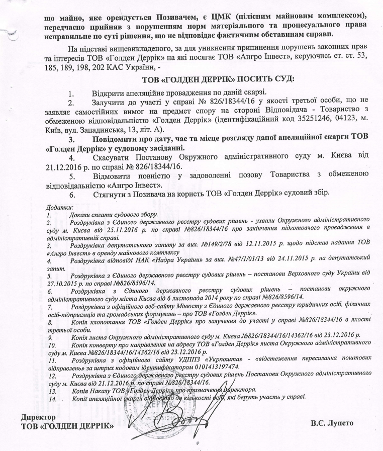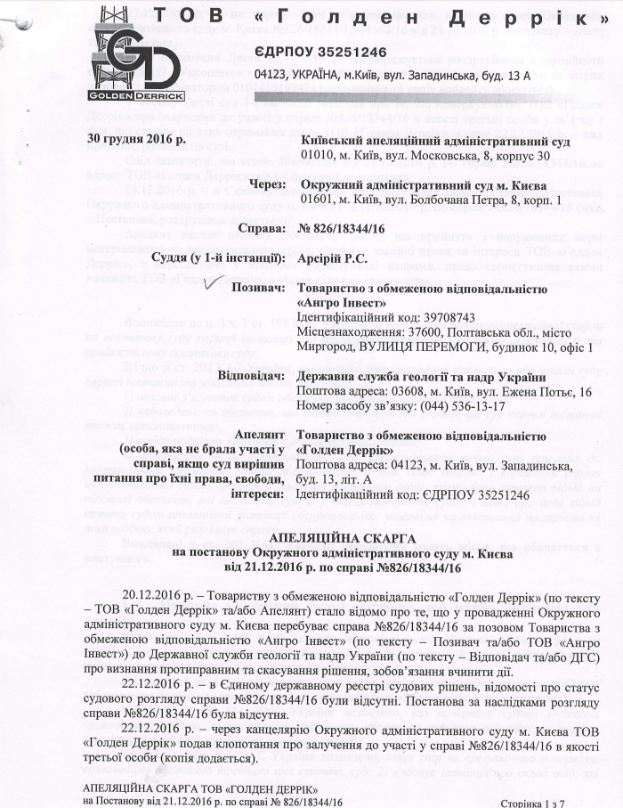 В марте 2014 года по инициативе Генеральной прокуратуры государство в лице Государственной службы геологии и недр Украины приостановило действие большинства специальных разрешений «Голден Деррика». Однако после двух лет судебных разбирательств, в сентябре 2016 года «Голден Деррик» неожиданно вернул себе через суд право на разработку месторождений. Как сообщал ресурс Liga.net Государственная служба геологии и недр в конце августа — начале сентября возобновила Голден Деррик действия трех специальных разрешений (лицензий) на газовые площади в Полтавской, Харьковской и Днепропетровской областях.