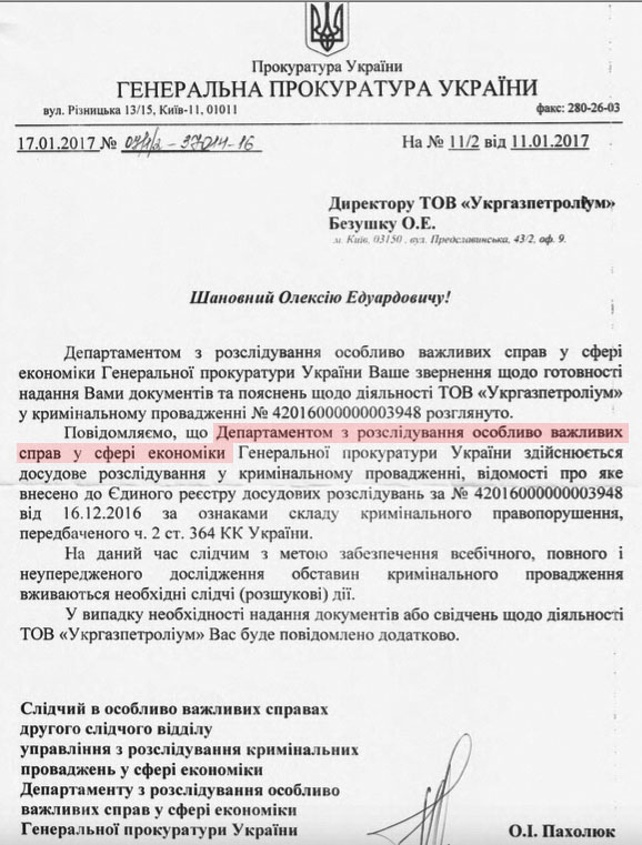 Паралельно з цим департамент з розслідування економічних злочинів Генпрокуратури (відомий в народі як "Департамент Кононенка-Грановського) через місяць після відкриття справи СБУ, для закріплення результату, починає своє розслідування за статею "Зловживання владою або службовим становищем".