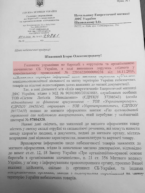 Управління "К" СБУ, яке має боротися з корупцією, направляє листи на адресу Енергетичної митниці з вимогою проводити огляди, відбори проб та не допустити митне оформлення скрапленого газу, який надходить на адресу 16 провідних імпортерів. Причина – начебто наявність у цистернах отруйних чи сильнодіючих речовин. Лист підписано заступником Павла Демчини – смотрящого Грановського за СБУ, який відповідає за весь тіньовий бік роботи спецслужби.