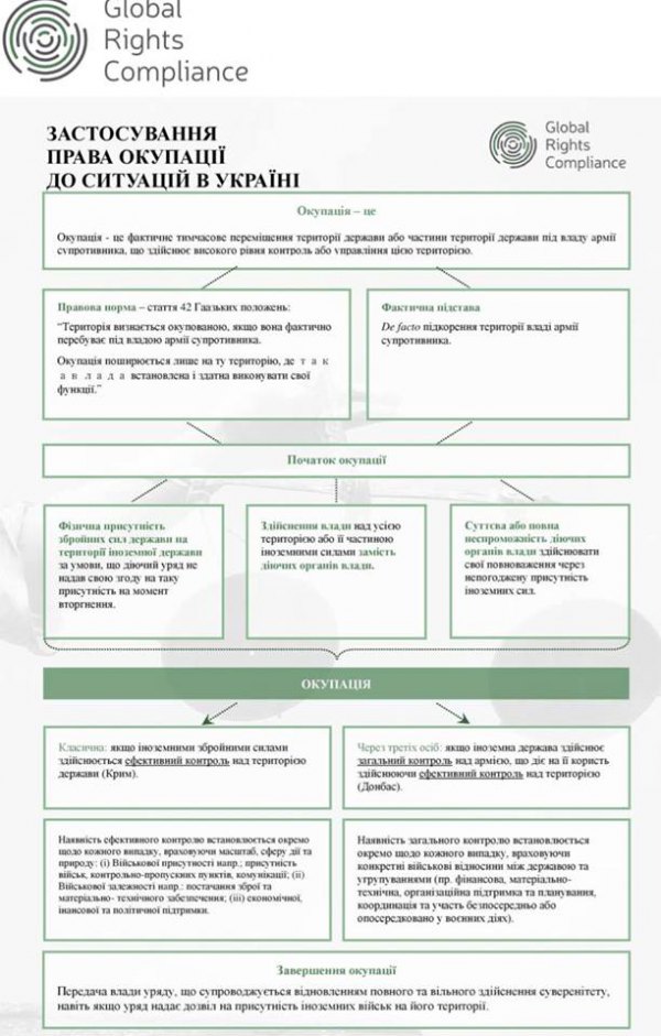 "З положень статті 42 та практики її тлумачення випливає, що окупація – це, по суті, тимчасове перебування території держави або частини території держави під владою армії супротивника, яка здійснює високий ступінь контролю чи управління такою територією. Єдиною фактuчною підставою визначення існування окупації є де-факто передача території під владу армії супротивника.