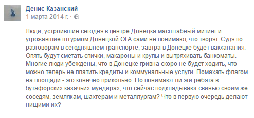 Просто репостну свой же пост от 1 марта 2014 года. Чтобы дончане и луганчане помнили, кого нужно благодарить за гибель людей, отсутствие пенсий, зарплаты в 3000 рублей и всеобщую разруху.