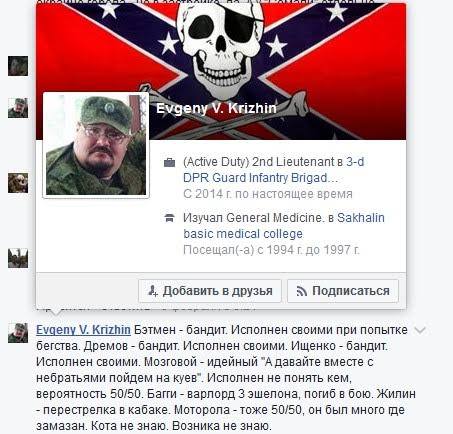 Российский наемник Евгений Крыжин, лейтенант 100-й бригады Республиканской гвардии оккупационных войск РФ на Донбассе, рассказал, кто, по его информации убивает полевых командиров РФ. Крыжин прошел типичный путь российского наемника. Жил на Сахалине, постоянной работы не имел, а тут случилась война, и все в жизни начало получаться - на Донбассе ему обеспечили жилье, дали зарплату, он назвал себя связистом, и нашел себе отличный доход - писать в интернете как лихо он воюет с "укропами", не приближаясь к передовой ближе чем на 5 километров, а в РФ немало идиотов, кто шлет ему денежки. Крыжин интересен тем, что у него много контактов с такими же намениками, для которых война на Донбассе единственное место, где они могут устроиться в жизни.