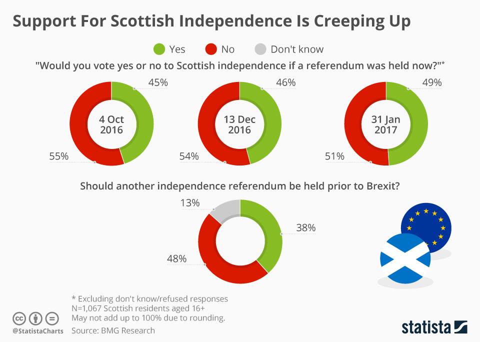 По мнению некоторых бывших высокопоставленных чиновников ЕС, которых опросила Financial Times, в случае отделения и поддержки других стран Евросоюза Шотландия не вступит в него ранее 2022-2023 годов. А действующая верхушка ЕС не устает повторять, что никакие переговоры о членстве даже не начнутся, пока Шотландия не получит официальный статус независимого государства.