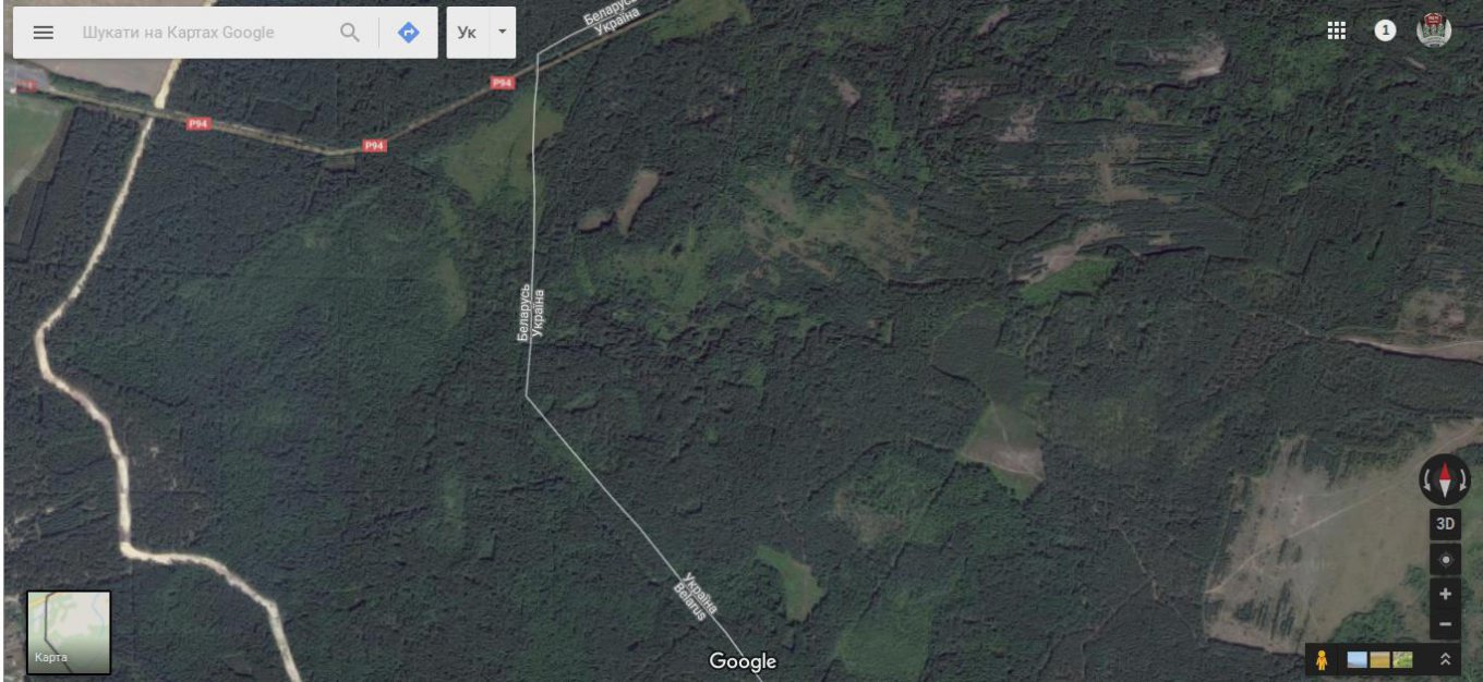 Ради интереса «прошёл» по лесной полосе вдоль границы с Беларусью: где проходит пограничная зона можно догадаться и без подсказок от сервиса картографии. Вот, например, иллюстрация