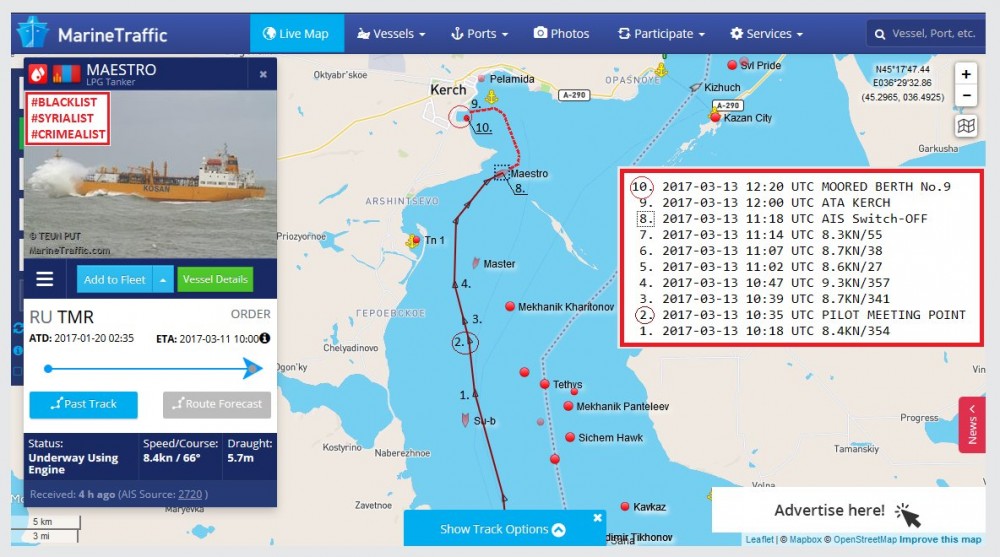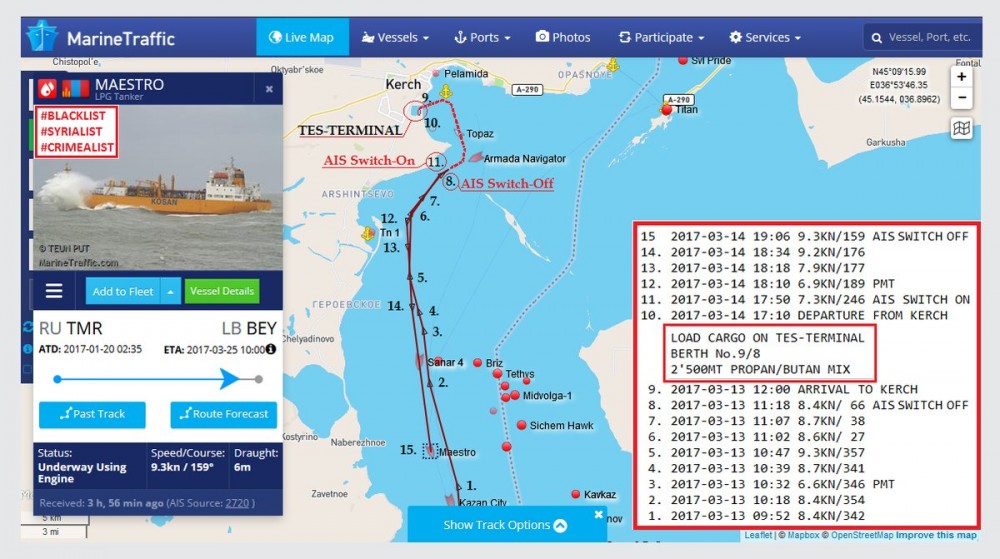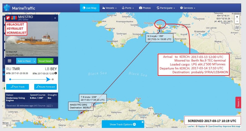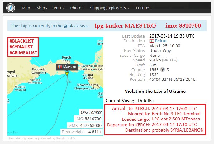 Из порта в Керчи продолжается вывоз энергоресурсов контрабандистами, которым плевать на статус оккупированного полуострова. В частности, с грузом пропана на борту в Босфор вошёл танкер "Maestro" (под флагом Монголии). Однако, проделать ему это незамеченным не получилось и активисты отслеживающие незаконное пересечение украинской морской границы взяли данное судно "на карандаш". Возьмут ли его так же наши власти? Посмотрим. А вот то, что Турция весьма вяло, реагирует на подобных нарушителей, увы - это факт.