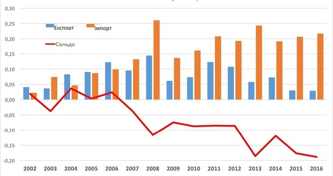 Зовнішня торгівля між Україною та Канадою у 2002-2016 рр., млн $