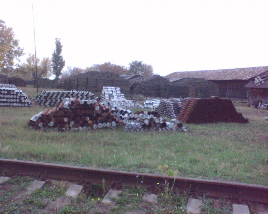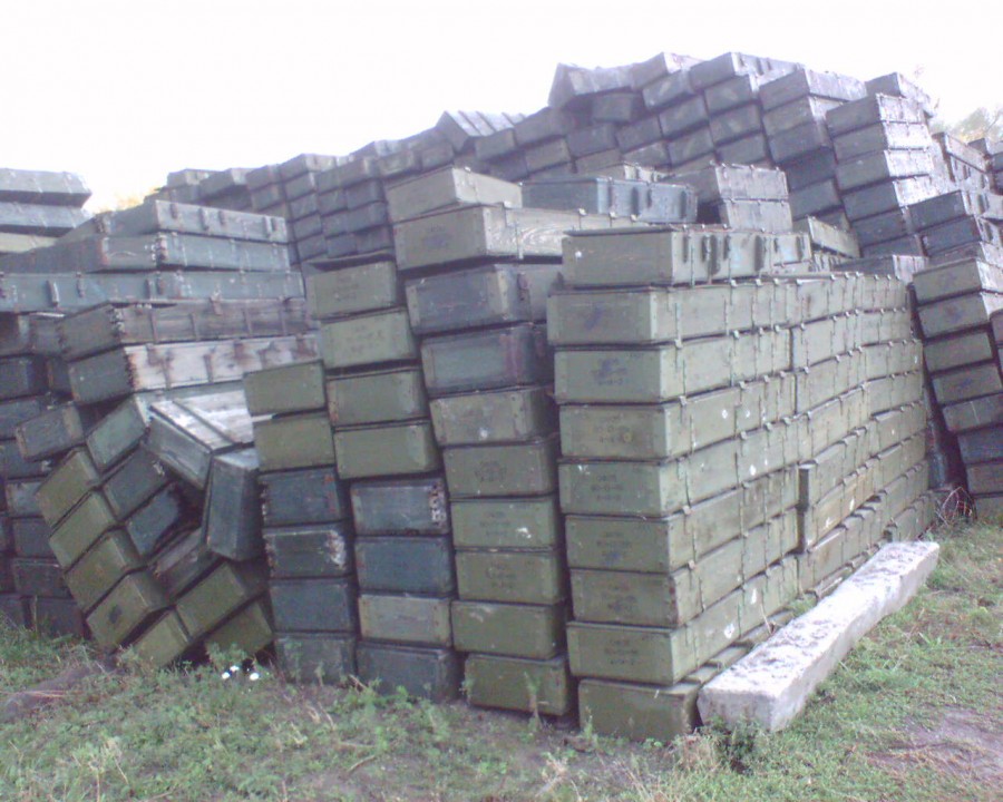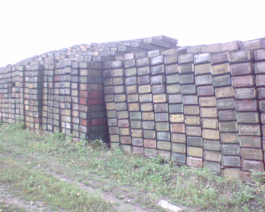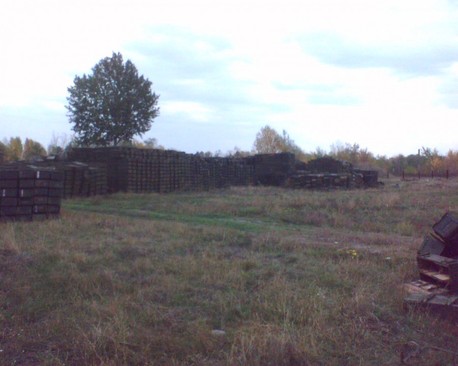 Штабеля ящиков уходят в даль. На этом снимке видно, что большая часть территории открыта. Снаряды просто ржавеют на земле, или хранятся в каких-то мрачных деревянных сараях.