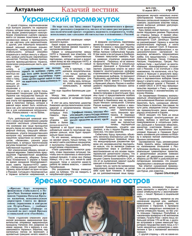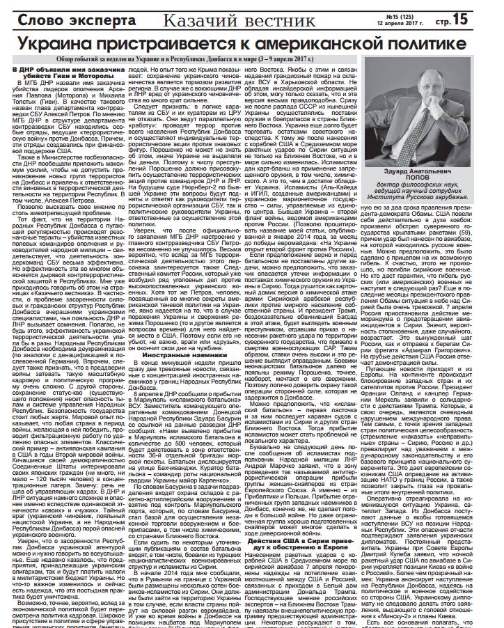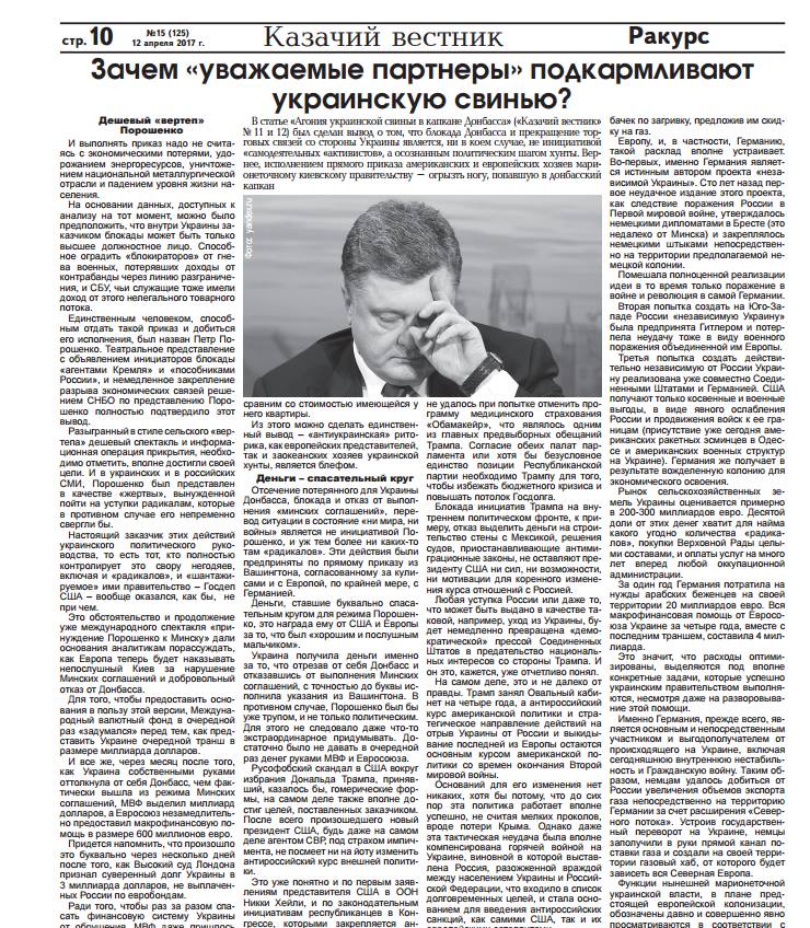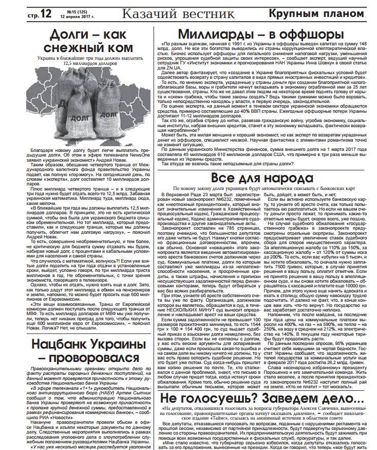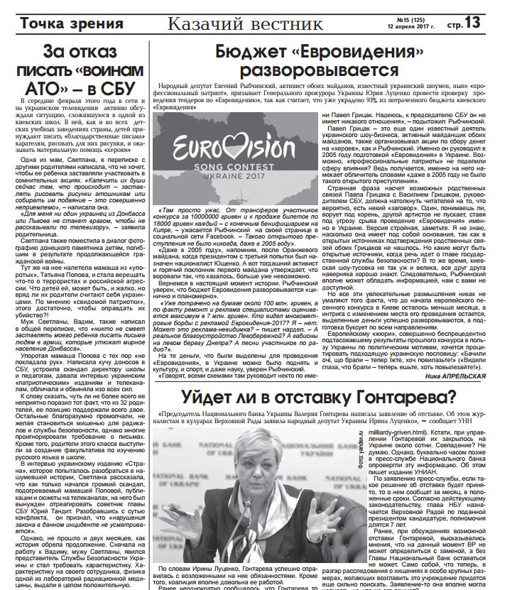 Прислали газету "Казачий вестник" из Стаханова. Хотел почитать, что там в ЛНР творится. А там про ЛНР толком ничего и не написано. Зато вся газета про Украину. Про Гонтареву, про Яресько, про Порошенко, про Евровидение.