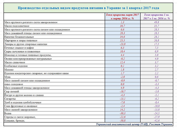 Что же нас держит на плаву? Как и можно было ожидать, это - производство продуктов питания. Именно эта сфера экономики пытается спасти экономику Украины от более существенных потерь. За март 2017 года пищевая промышленность показала рост 7,5% по сравнению с аналогичным периодом прошлого года. Что же касается 1 квартала 2017 года, то рост на уровне 5% в целом заслуживает уважения и восхищения. При более детальном анализе можно заметить, что прежде всего был зафиксирован рост продукции пищевой промышленности в натуральных показателях за март 2017 по сравнению с мартом 2016 года: производство подсолнечного масла (+36,7%), мяса птицы (+29,3%), маргарина (+25,5%). Это действительно успех, и это еще раз показывает, что отдельные сектора нашей пищевой промышленности могут развиваться и расти даже в условиях кризиса.