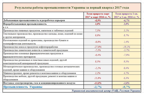 Действительно промышленность Украины за март 2017 года зафиксировала падение на 2,7% по сравнению с аналогичным периодом прошлого года. Но январь-февраль текущего года частично нивелировал это падение и поэтому в целом за первый квартал 2017 года промышленное производство в Украине упало всего на 0,7% по сравнению с аналогичным периодом прошлого года. А теперь больше фактов.