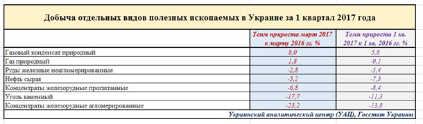 Начнем с металлургии. За март текущего года производство чугуна в натуральных показателях упало на 23,3%, полуфабрикаты из стали - на 35,2%, прокат черных металлов на 8,4% по сравнению с аналогичным периодом прошлого года. Самое плохое, что упало производство полуфабрикатов из стали, поскольку это один из самых популярных экспортных товаров Украины. Чугун тоже часто идет на экспорт в США и Италию. Частично успокаивает, что выросло на 9% производство стали, а кроме того, выросло и производство изделий с металла (типа резервуары или отопительные батареи). Но они не могут полностью компенсировать потерю производства металла, который шел на экспорт. Поэтому все надежда на рост цена на металл в мире, благодаря чему можно будет компенсировать объемы продажи. Стоит отметить, что это падение было вполне ожидаемо. Упала добыча угля за март 2017 года на 17,7% по сравнению с мартом 2016 года.