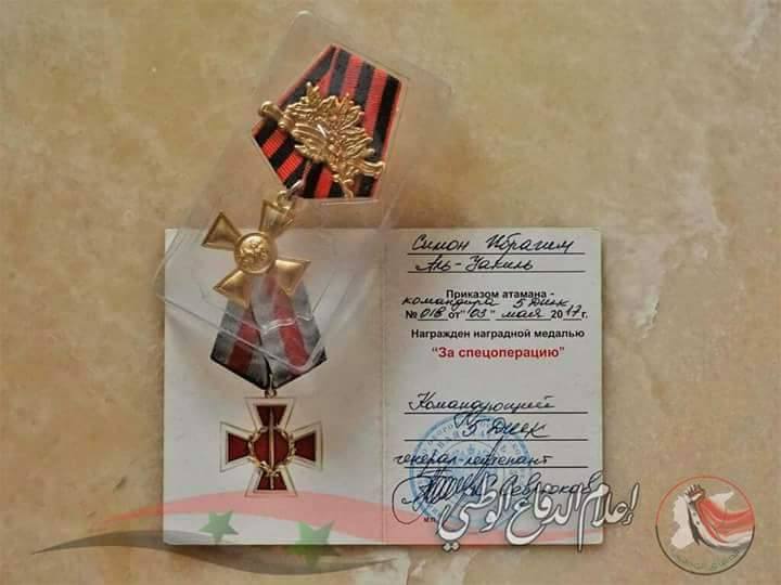 Сирийского боевика Симона Ибрагима Аль-Уякиля, который воюют на стороне президента Асада, наградил орденом в виде креста с георгиевскими лентами командир 5-го добровольческого штурмового корпуса Сирийской армии.