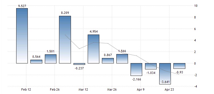 3 мая EIA (подразделение Министерства Энергетики США, федеральное статистическое агентство распространяющее информацию об энергии и энергетике) представило очередной отчет по запасам и добычи "чёрного золота" в США и согласно ему добыча нефти за неделю показала рост на 28 тыс баррелей в сутки, составив рекордные 9,293 млн. Но, дальше - больше! Ведь запасы нефти в США четвертую неделю к ряду уменьшаются и за прошедший семидневный цикл отток составил 0,93 млн баррелей.