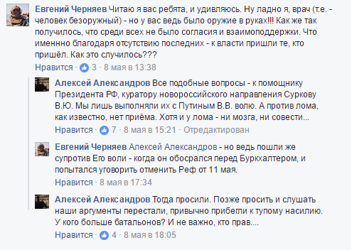 Так, один из активных участников "русской весны", бывший руководитель "аппарата народного совета ДНР" Алексей Александров, который как раз принимал в организации "референдума" самое непосредственное участие, признался в Фейсбуке, что действовал не в интересах жителей Донбасса, а выполнял указания Путина и Суркова.