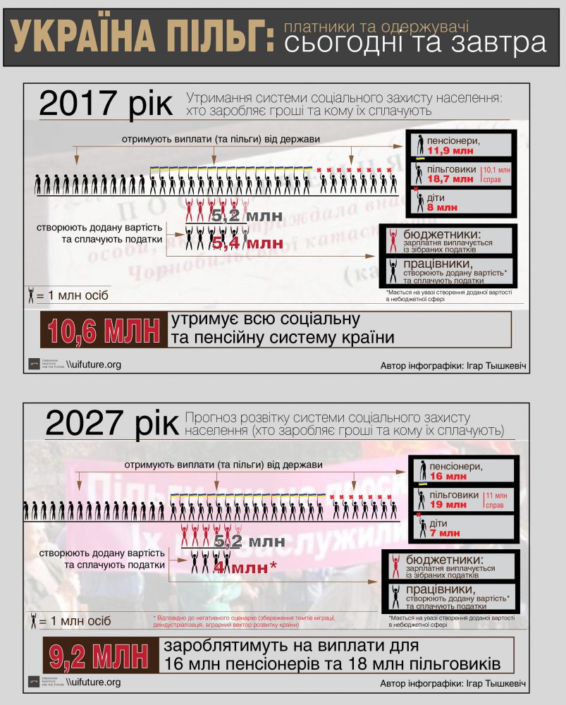 На первый взгляд, всё не так плохо — в 2017 году на 25,5 миллиона работников имеем 11,9 миллионов украинцев «на заслуженном отдыхе». К 2027 пропорция будет 22,8/16.